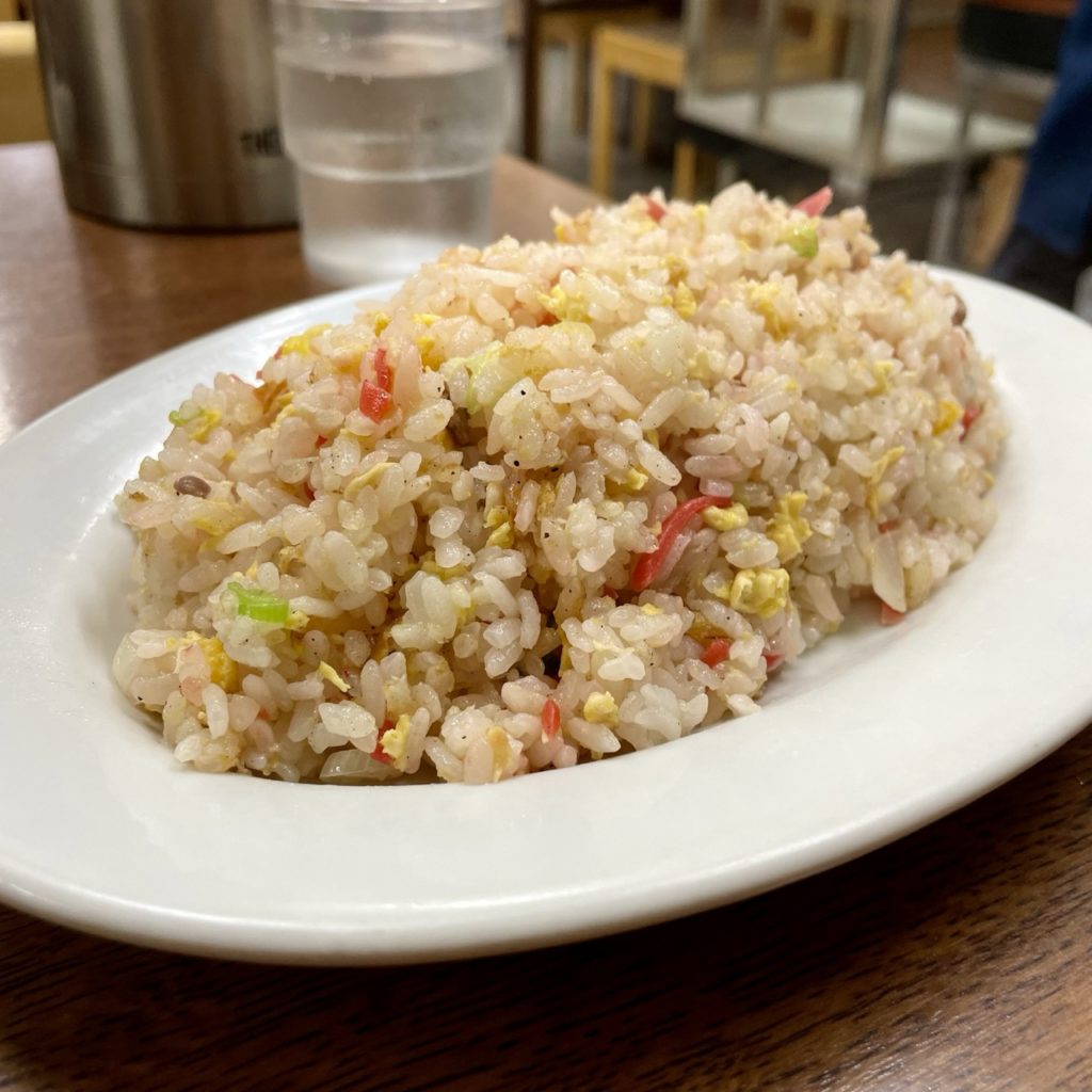 紅生姜が添えられている炒飯はよく見かけますが、こちらは具材として一緒に炒められているのがまた面白い。