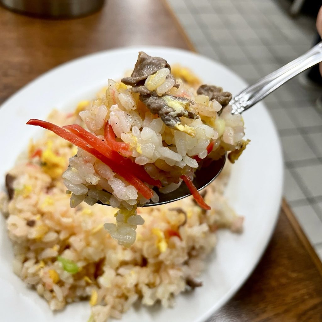 特徴的なのは、やきめしには珍しくメイン具材が牛肉なんですよね。あとは玉子や玉ねぎ。