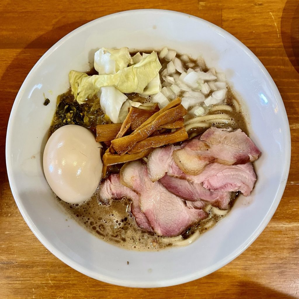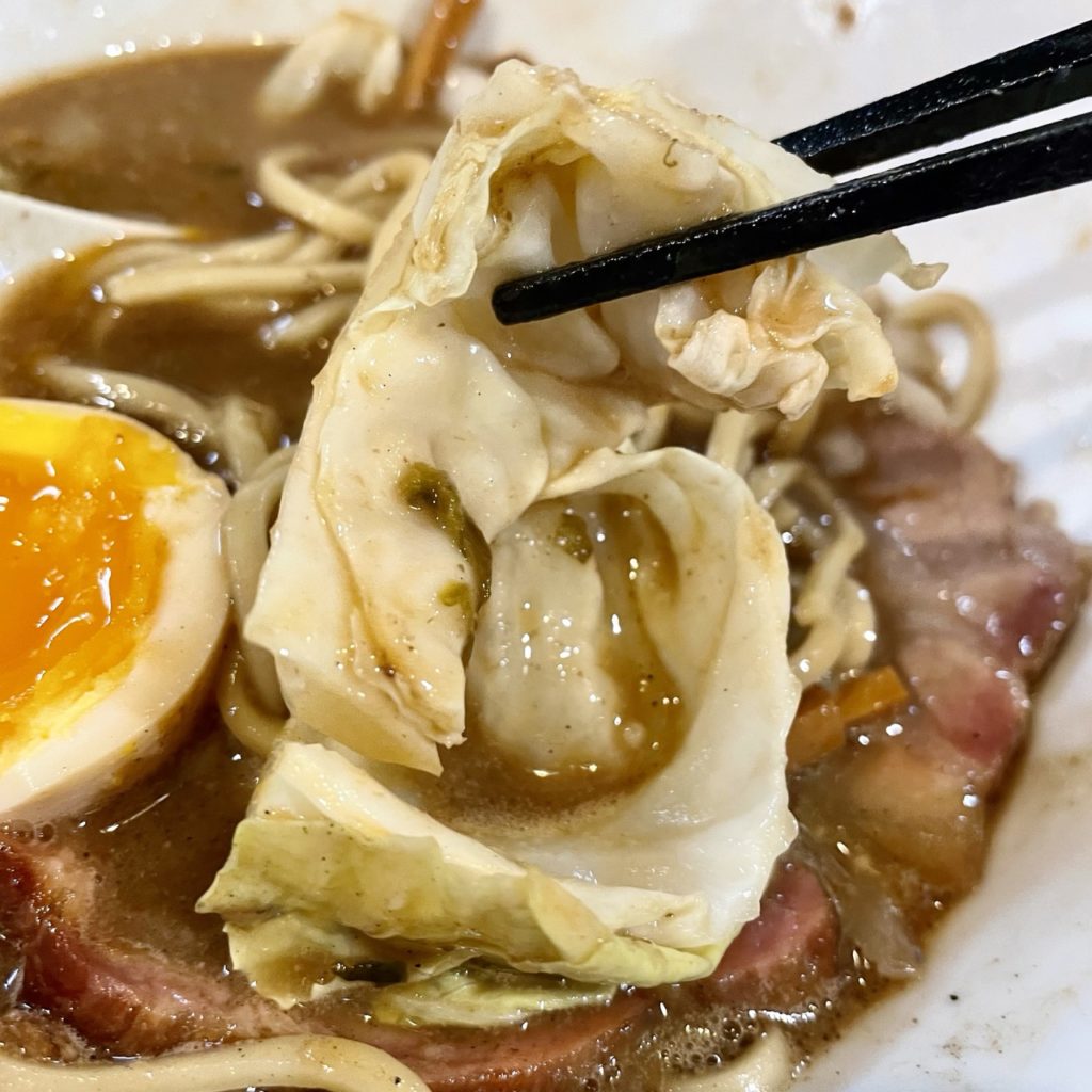 具材は吊るし焼豚・めんま・味玉・玉ねぎ・キャベツ・高菜とバラエティ豊か。