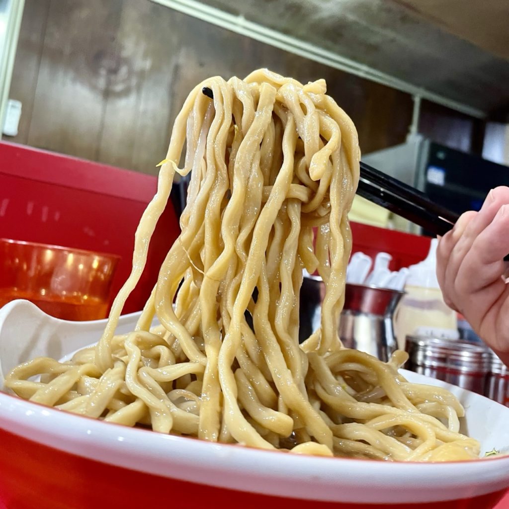 ありし日の富山のぶた壱とか、京都二郎の激太麺ぐらいの歯ごたえがあります。