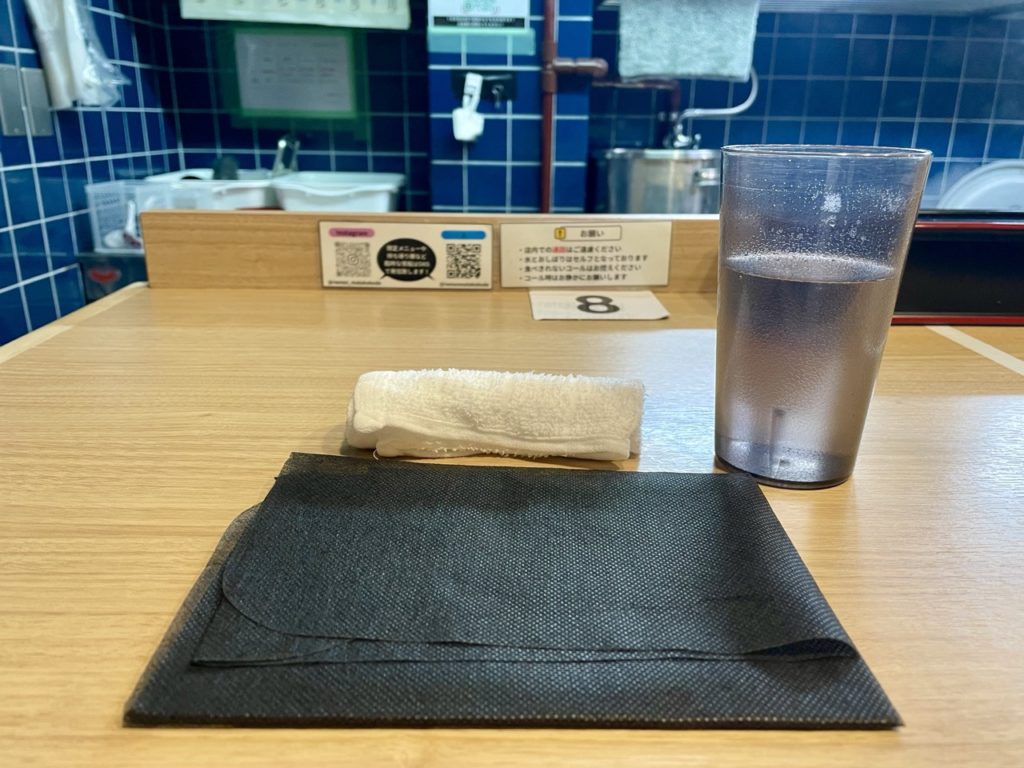 お水・おしぼりをセルフコーナーから準備し、レンゲと箸は席に備え付け。