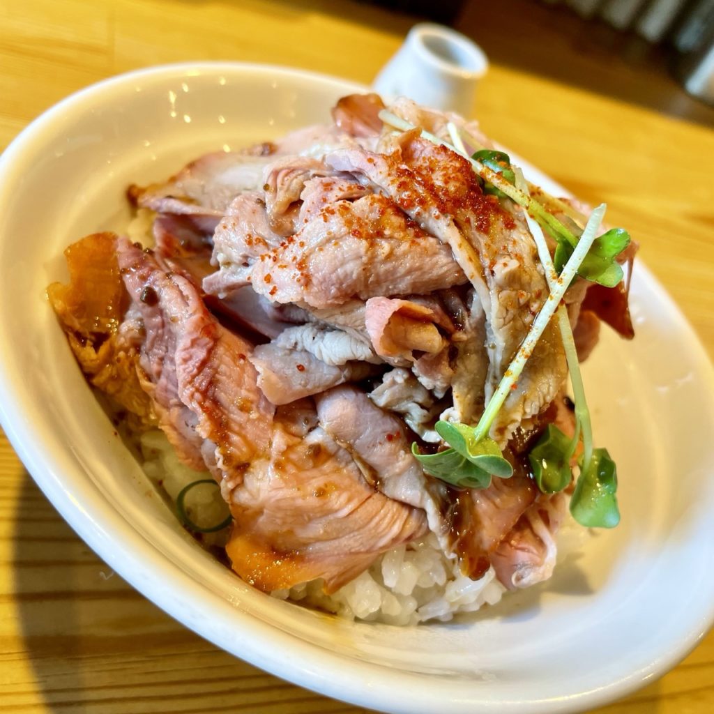 厨房内の入り口側にはチャーシューの吊るし焼き釜があり、焼き上がったチャーシューがそのまま名物ムギュ丼に使われるんですよね。