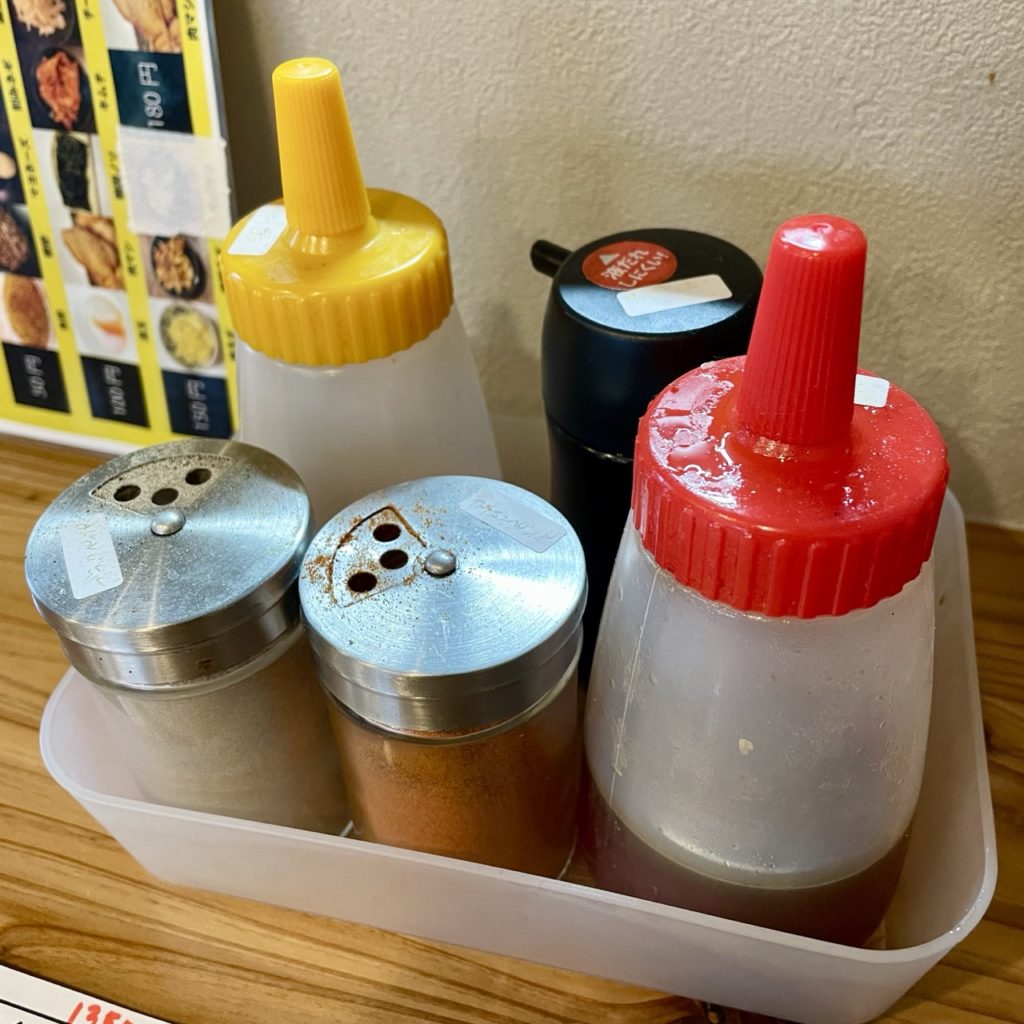 卓上調味料は手前からラー油・カイエンペッパー・ブラックペッパー・醤油・お酢。