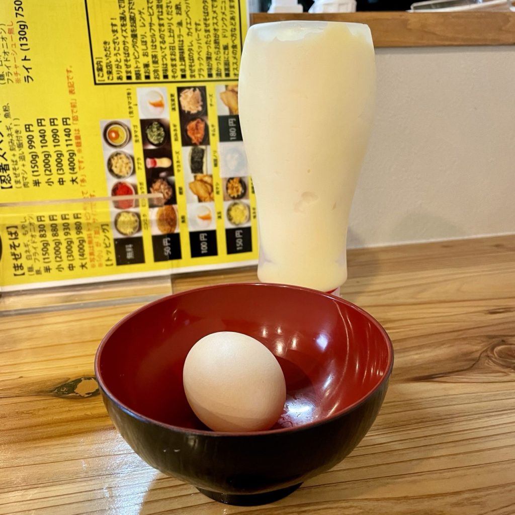 デフォのまぜそばの生卵も殻ごとで、好きなタイミングで割り入れることができます。