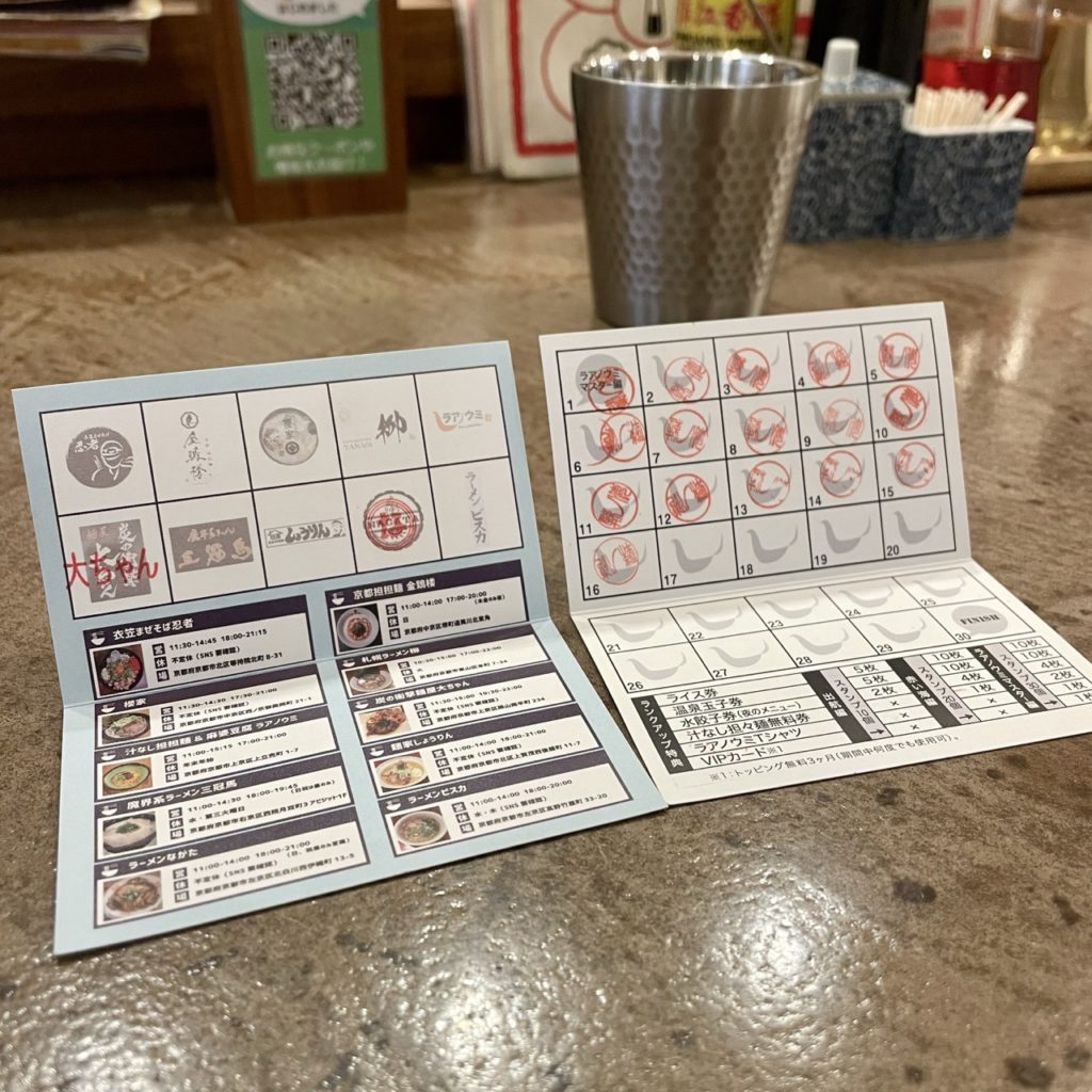 ラアノウミさんのスタンプカードに加えて、左側にあるのが京都新麺組(@shinmengumi)のスタンプカード。