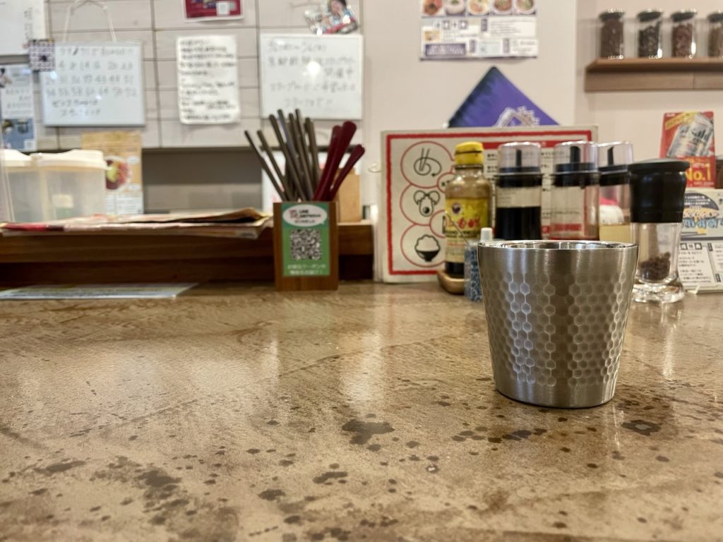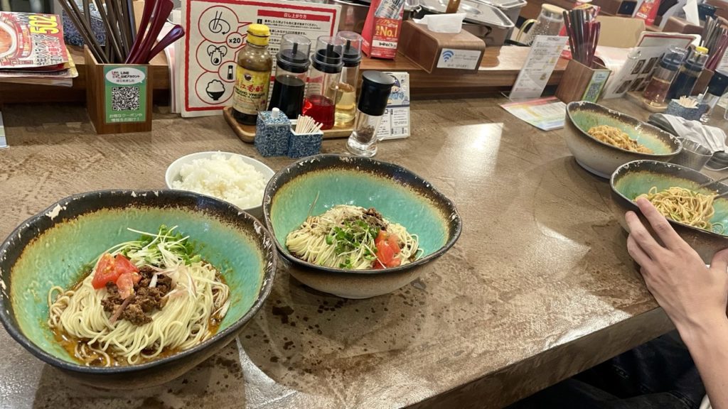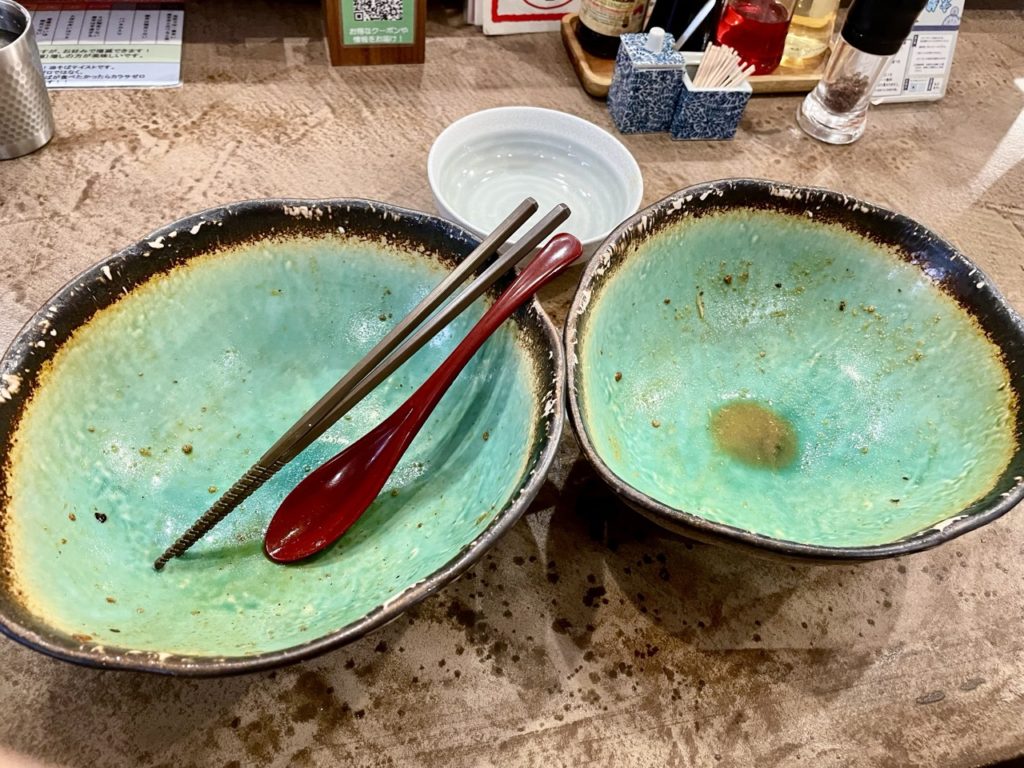 僕が2杯食べるって言うと、たろきちさんもデフォのラアノウミと汁なし麻婆麺の2杯食べることになり、カウンター上が賑やかに笑