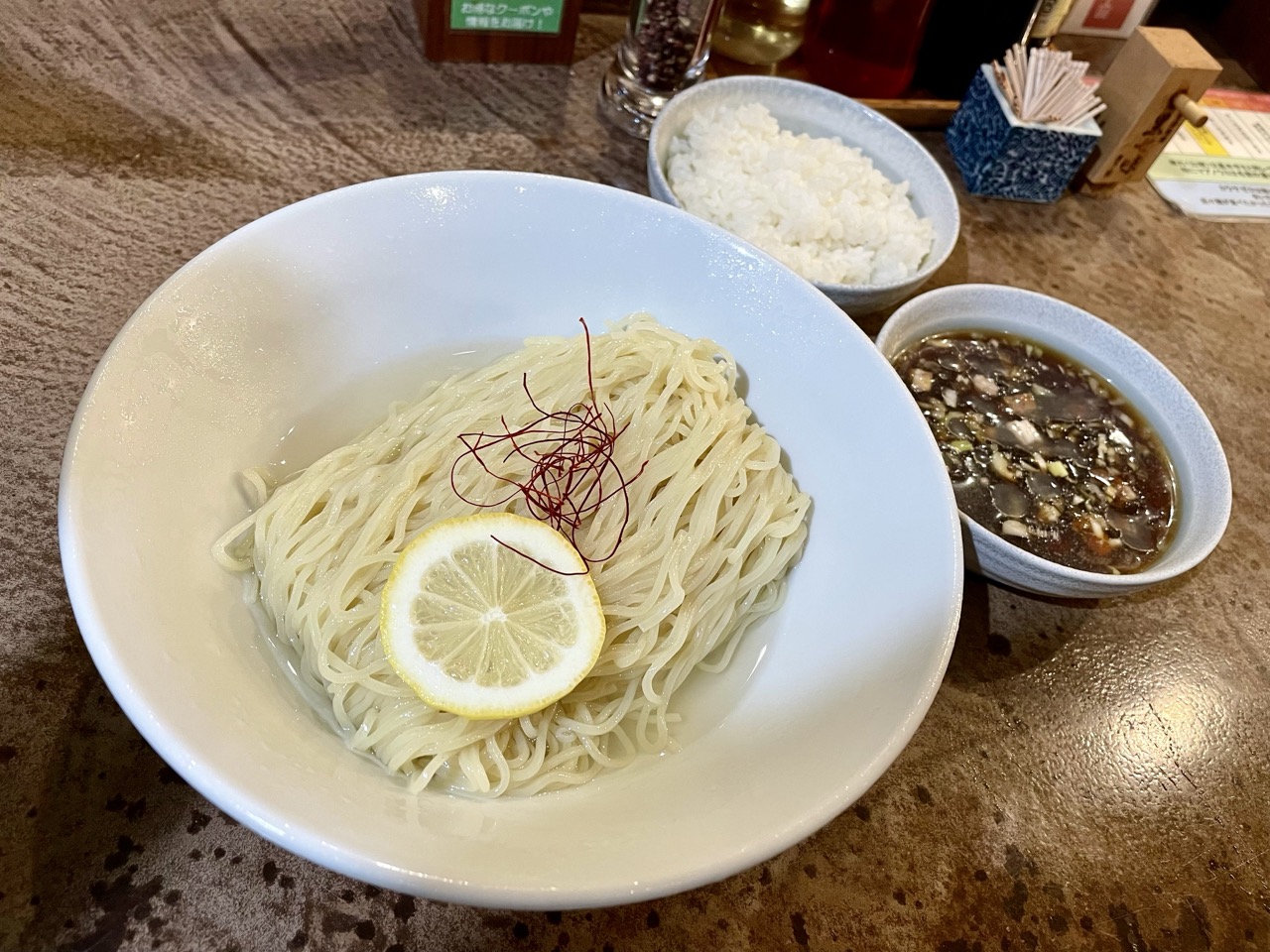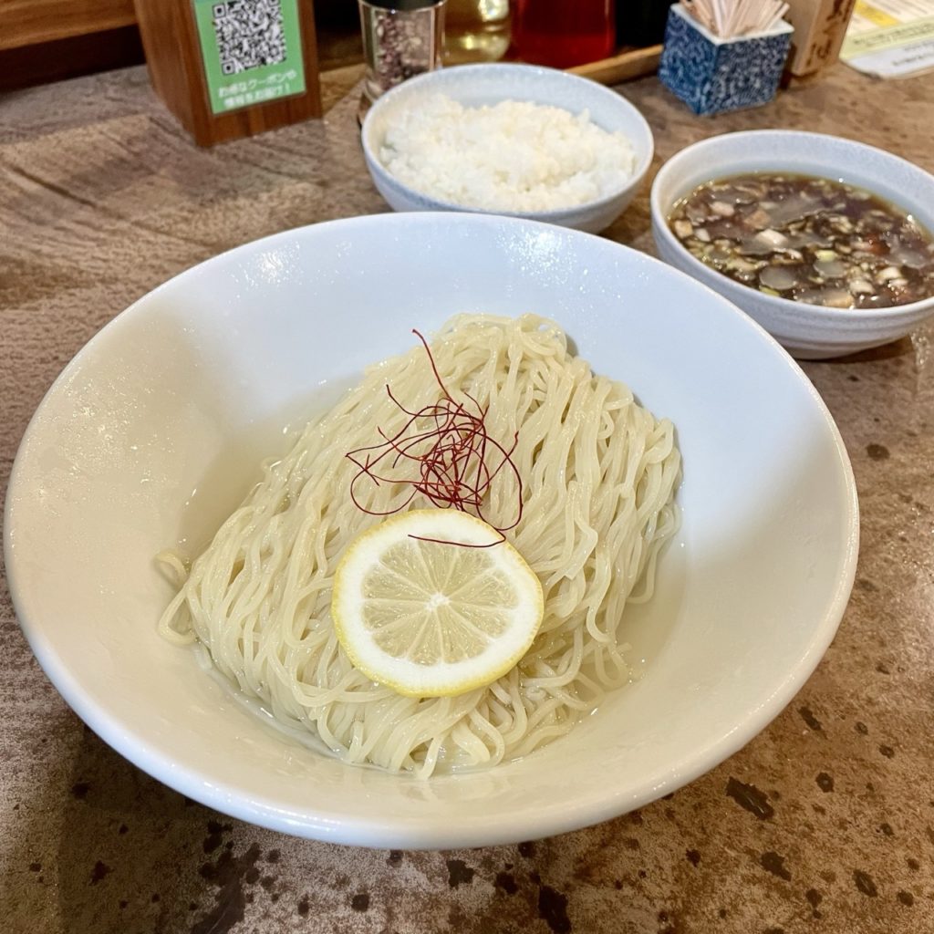 冷たいつけ汁に弾力のある冷たい多加水細麺。