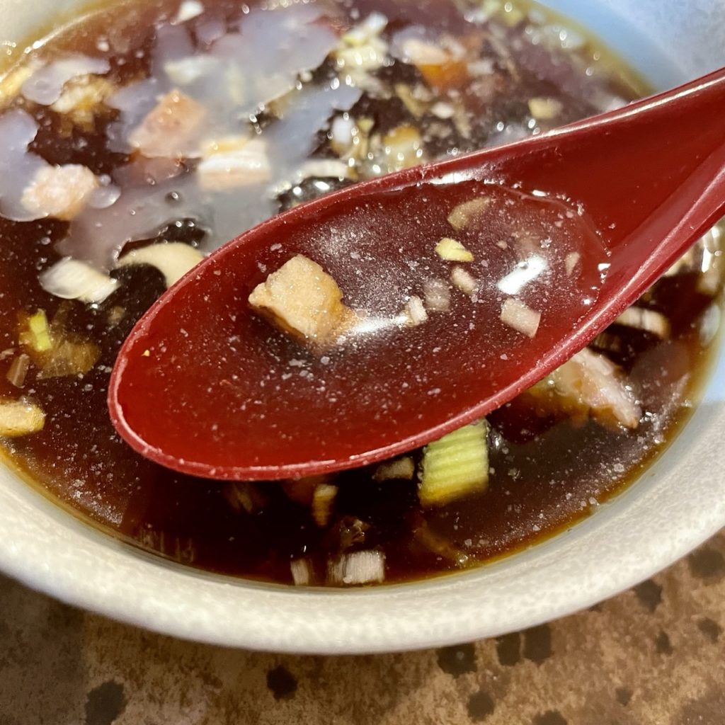 柚子胡椒の風味が効いてて汁だけ飲むとしっかり濃いめですが、思ってたよりも酸味は控えめで食べやすいと思います。