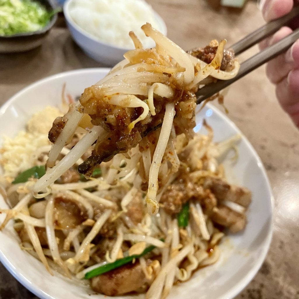 トッピングのヤサイなんですけどね、ただの茹でもやしじゃなくて、肉と一緒にフライパンで炒められてるんですよね!