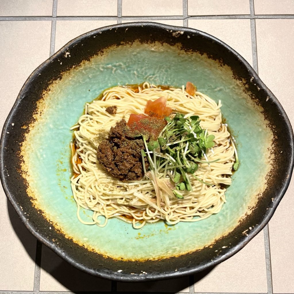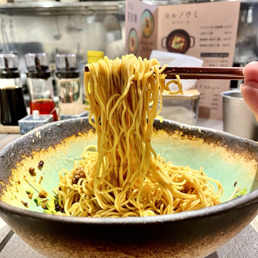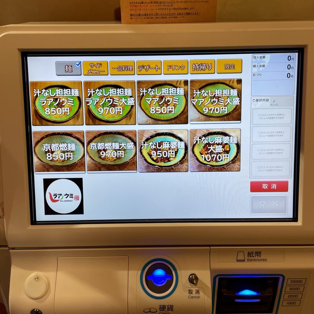 レギュラーメニューは汁なし担々麺のラアノウミ(胡麻ベース)・マアノウミ(醤油ベース)、京都燃麺、汁なし麻婆麺。