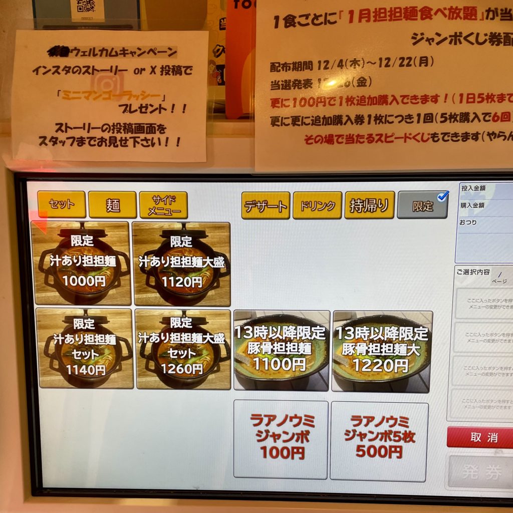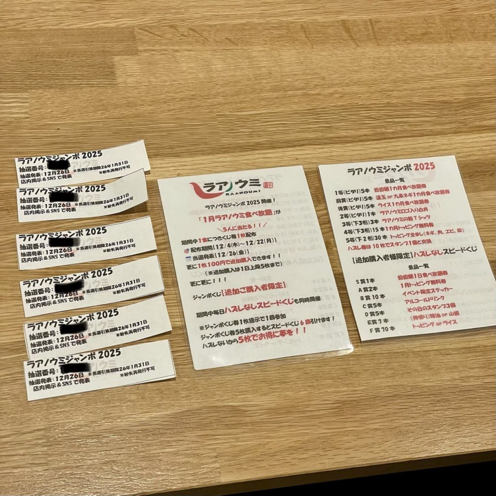 2025年12月4日〜12月22日の期間で麺類1食ごとにジャンボくじが1枚配布、12月26日に抽選発表というスケジュールで開催されます。