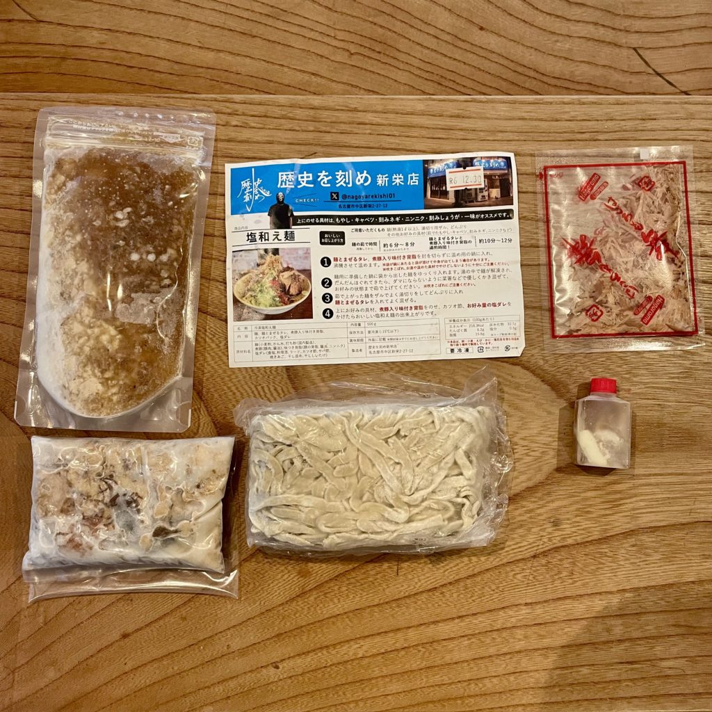 冷凍麺・麺とまぜるタレ・煮豚入り味付け背脂・塩ダレ・鰹節が付属しています。