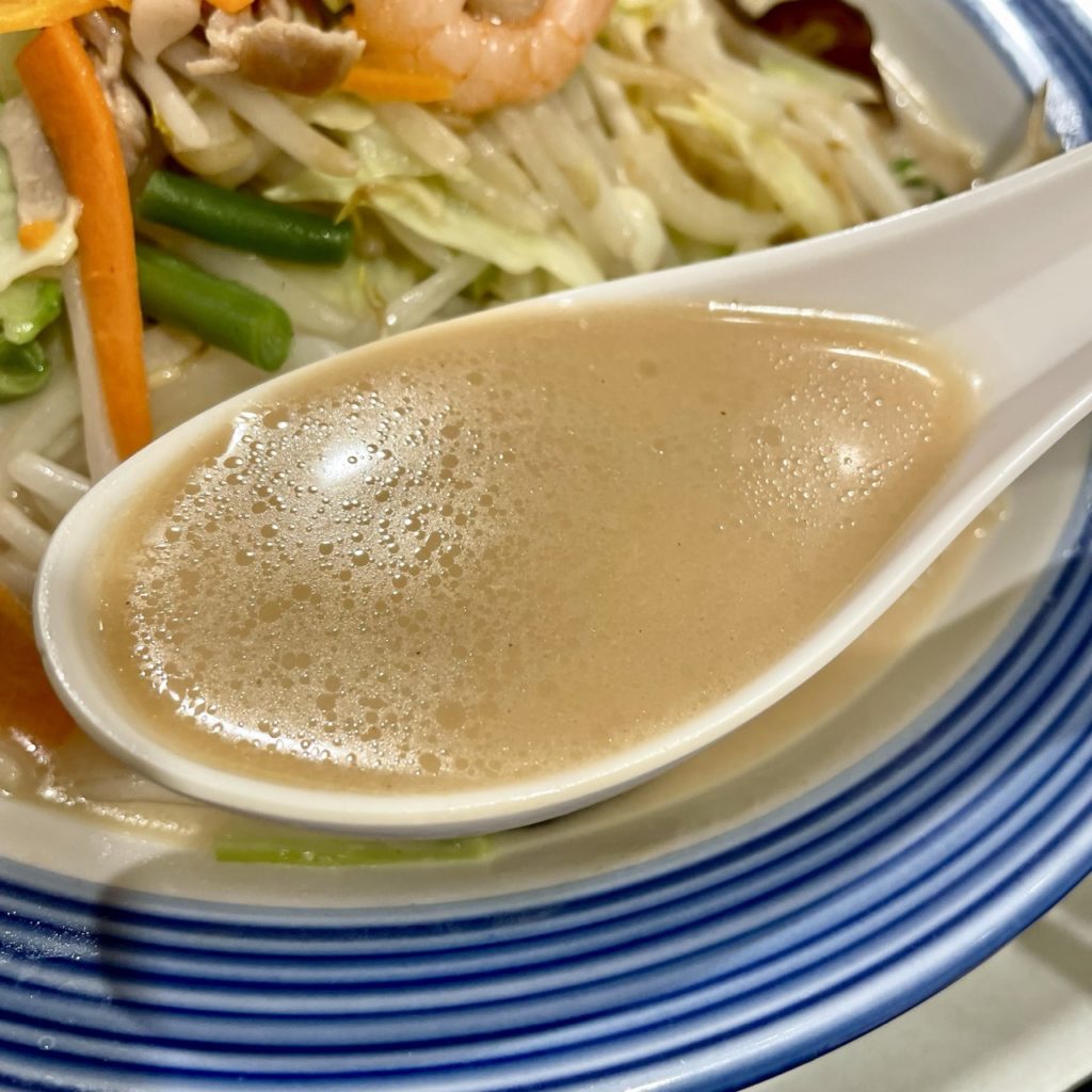 魚介ベースの白湯スープは、胡椒が効いたクリーミーな味わいで美味しい!