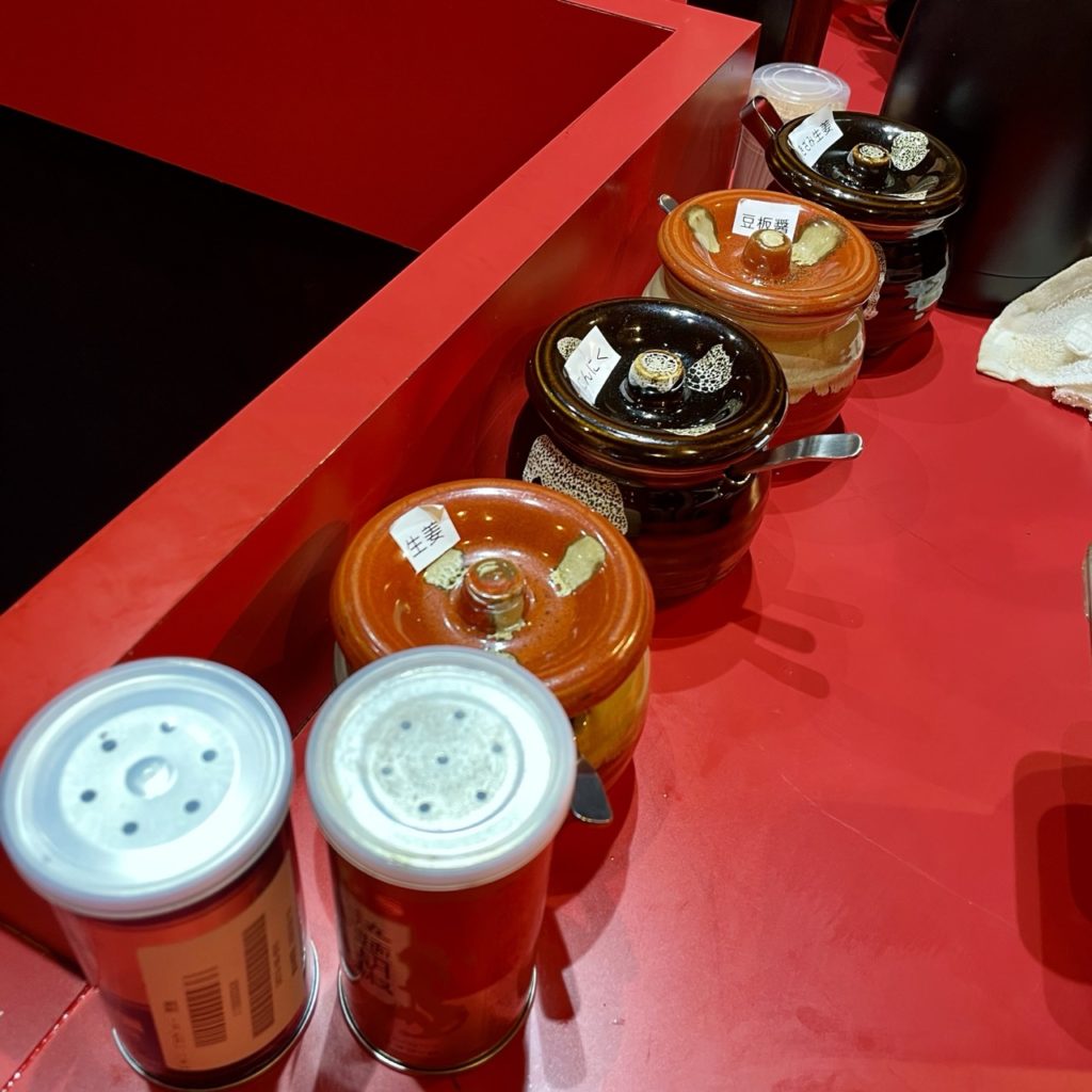 胡椒の隣の壺4種は手前からおろし生姜・おろしにんにく・豆板醤・きざみ生姜。