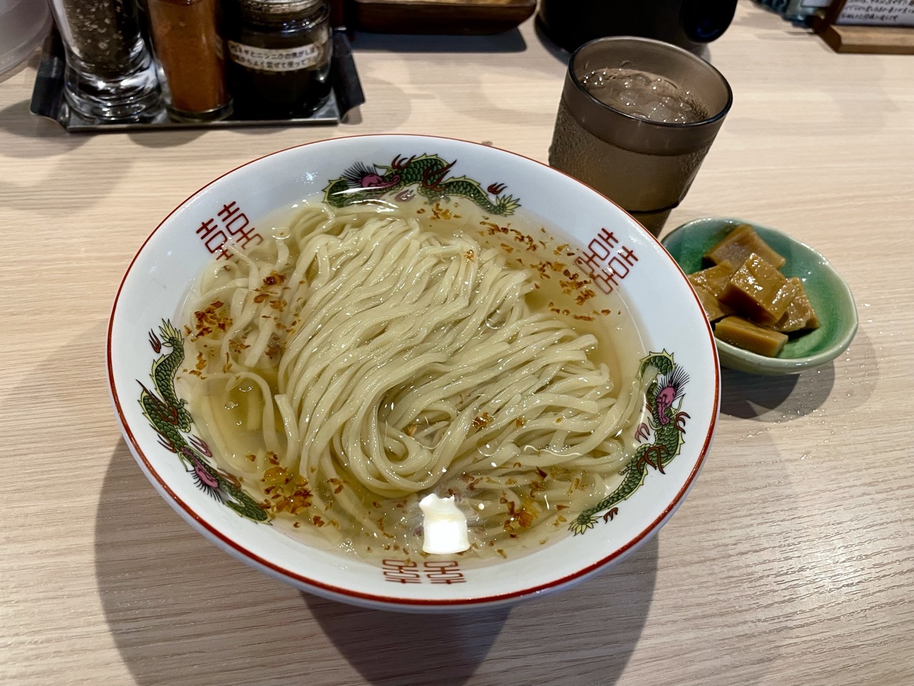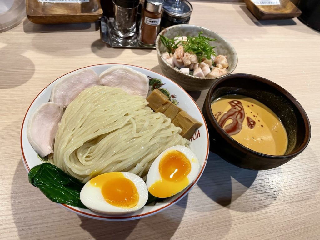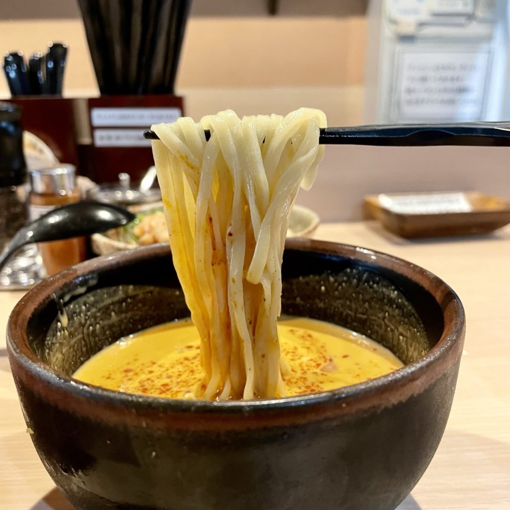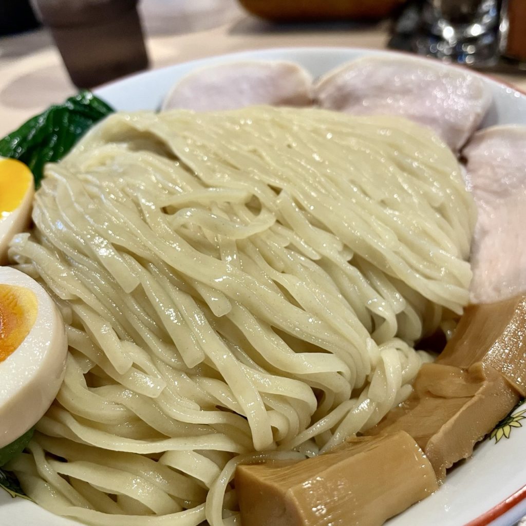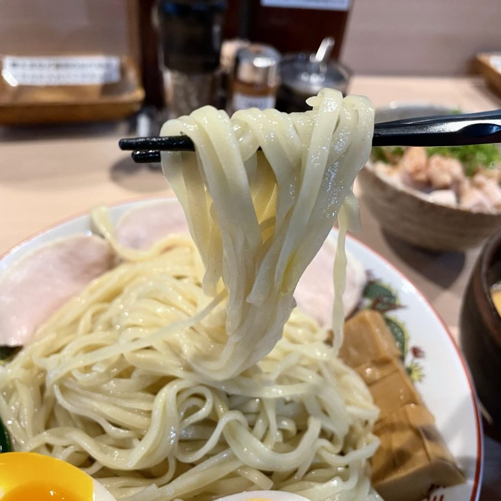 デフォのつけ麺よりもやや細めで、つけ麺の麺に比べると軽めの印象ですが、もっちり感があり小麦の風味を強く感じる美味しい麺です。