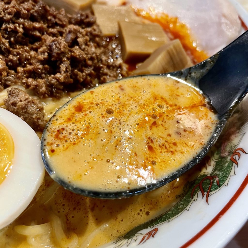 極クリーミーな豆乳スープに、自家製ラー油の爽やかなシビレが抜群のハーモニーを醸しとる!