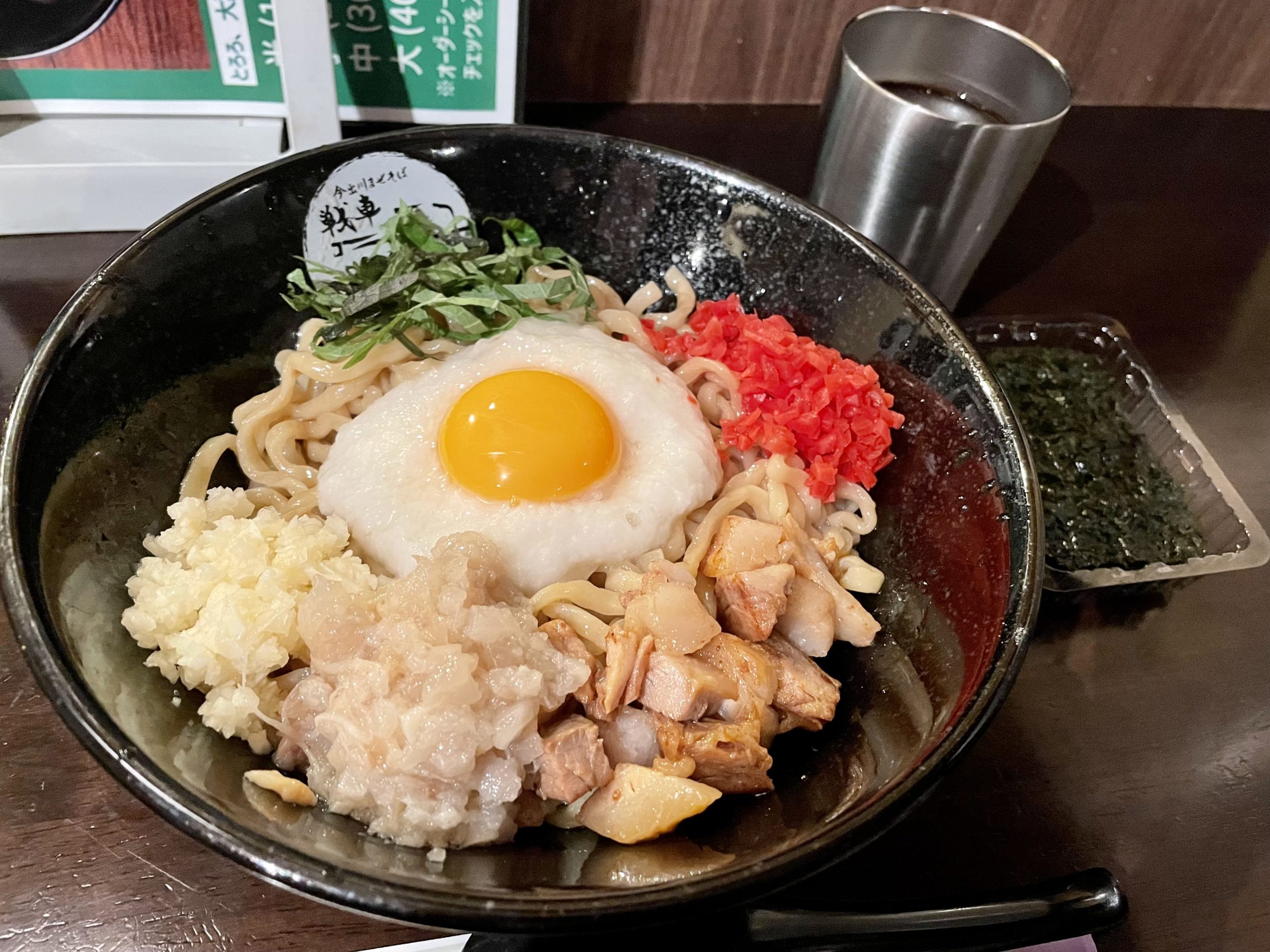 具材は刻みチャーシュー、背脂、紅生姜、大葉とろろ、卵黄になります。
