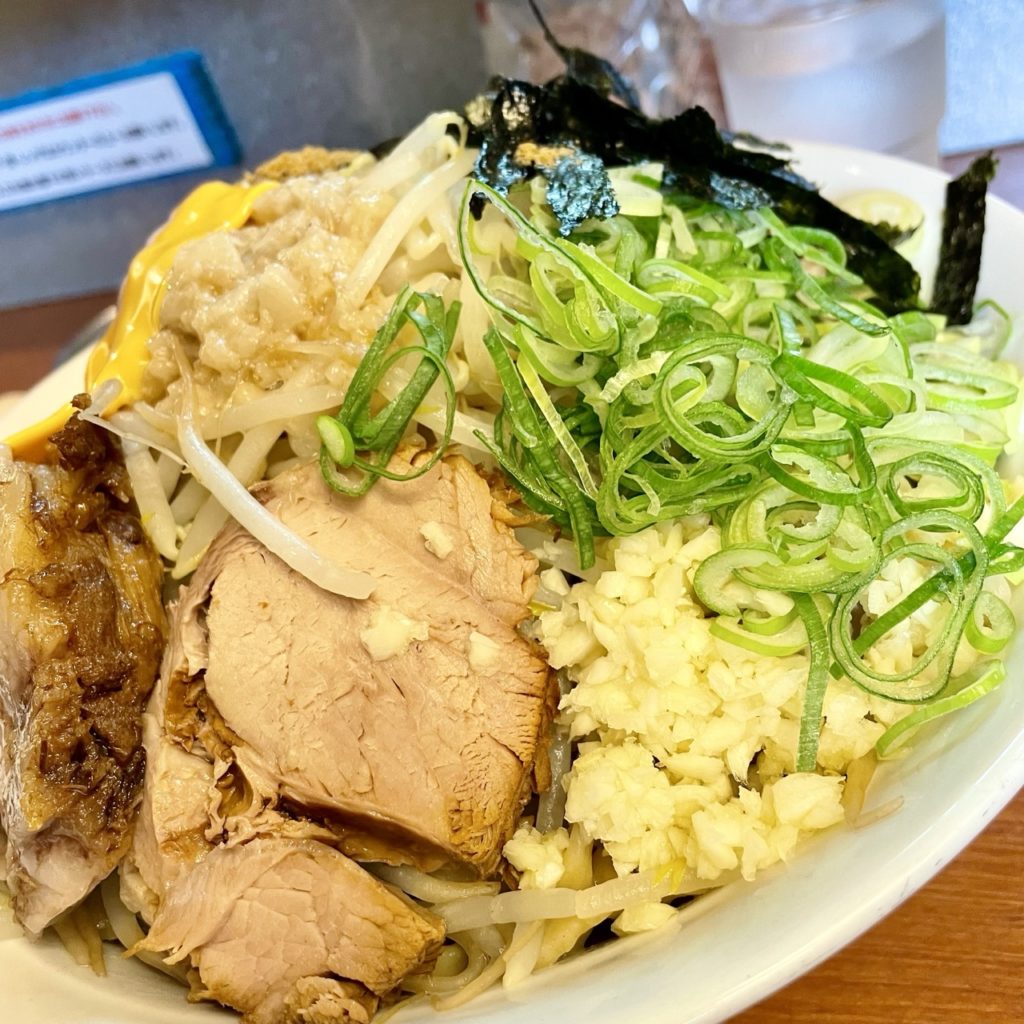 具材はいつものニンニク・豚・ヤサイに加えて限定の塩アブラ・ネギ・海苔・魚粉という賑やかなトッピング陣。