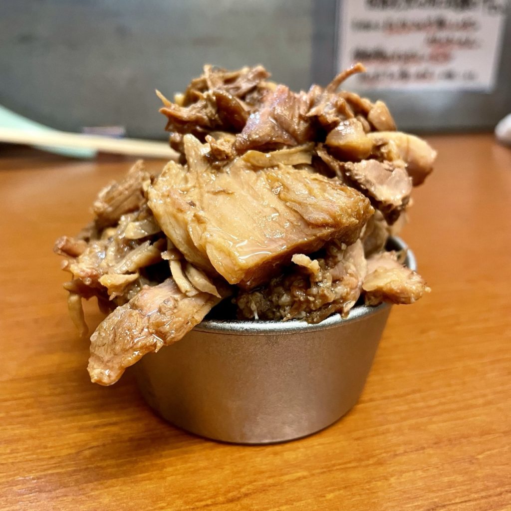 アブラドレッシングがなくなったら豚をおかずにヤサイを食べ進めるのがセオリーなんですが、ほぐし豚をそのお悩みを解決する最高のアイテム!