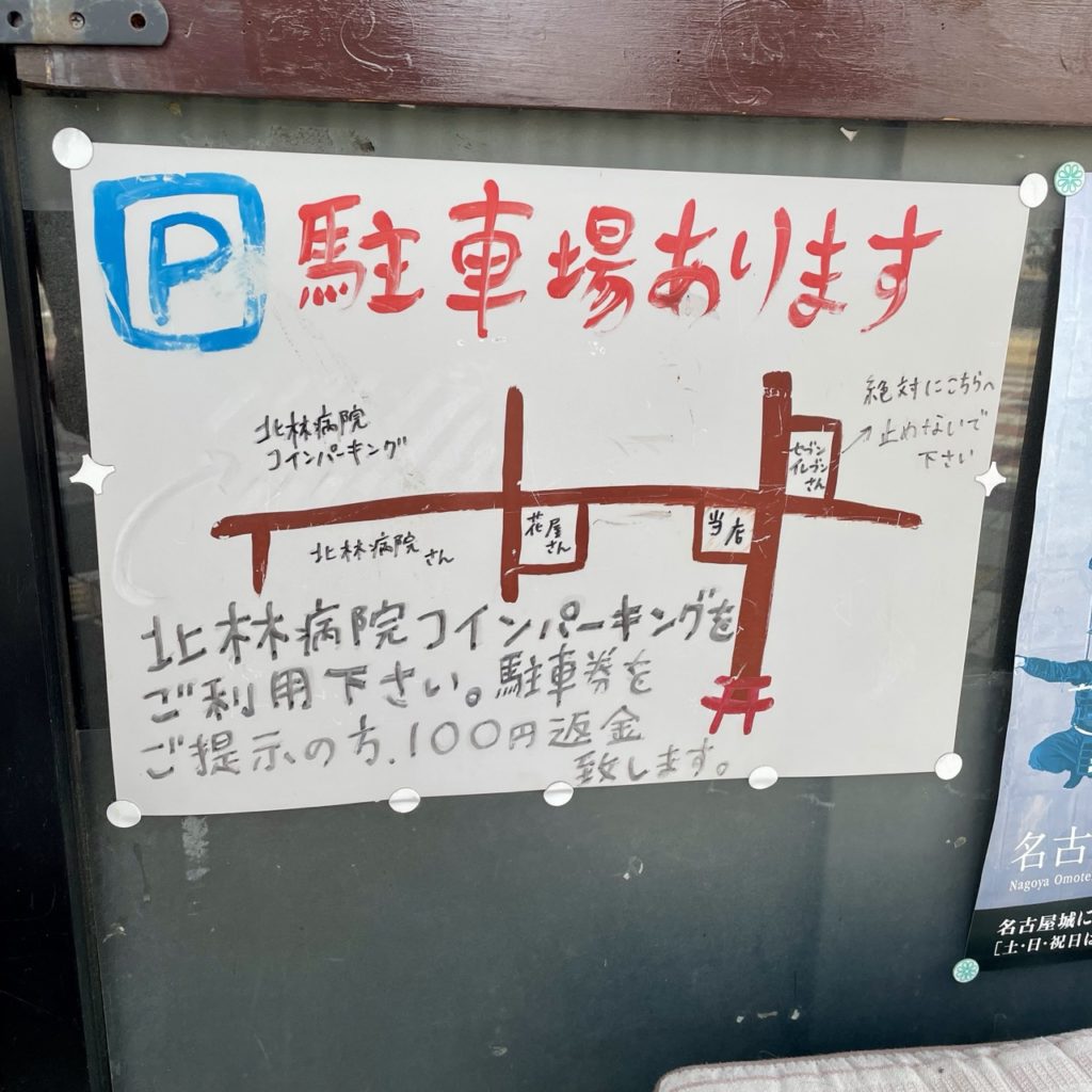専用駐車場はありませんが、指定のコインパーキングに駐車し、会計の際に駐車券を提示すると100円のキャッシュバックを受けることができます。
