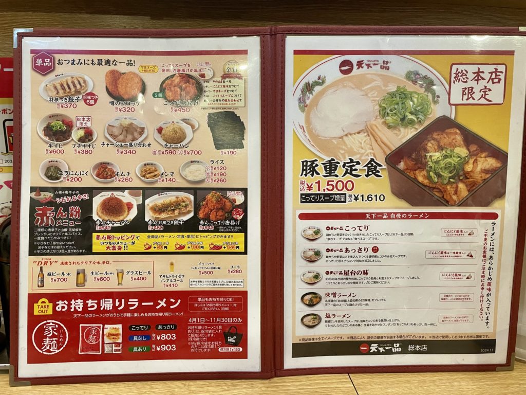 天一は店ごとに扱うメニューや価格が違うため、公式サイトにもメニューがありません。