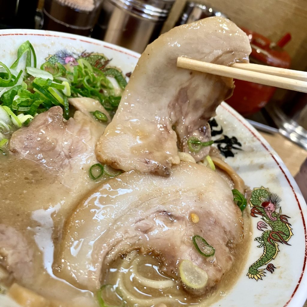 この豚トロチャーシューが何故こんなに美味いのかを考えると、薄切りだからこそこの口溶けが再現できているのだと思います。