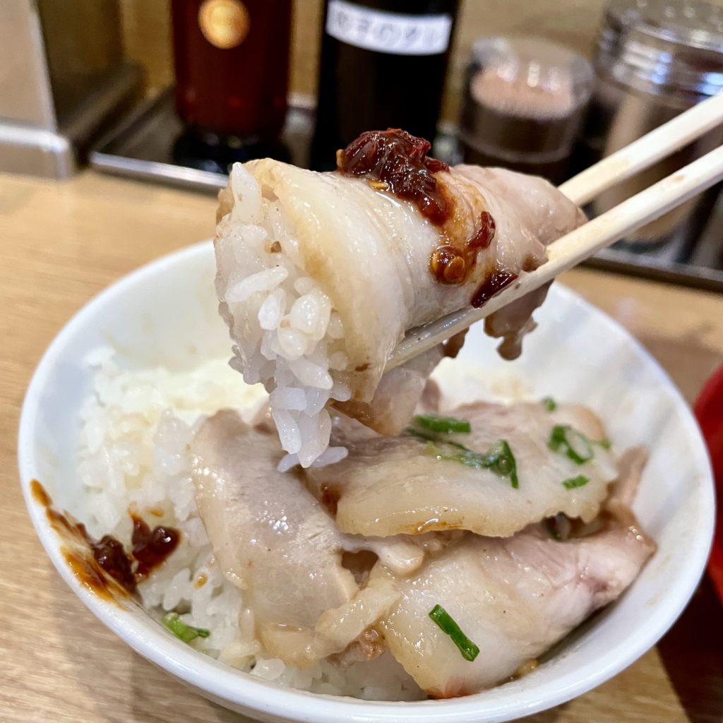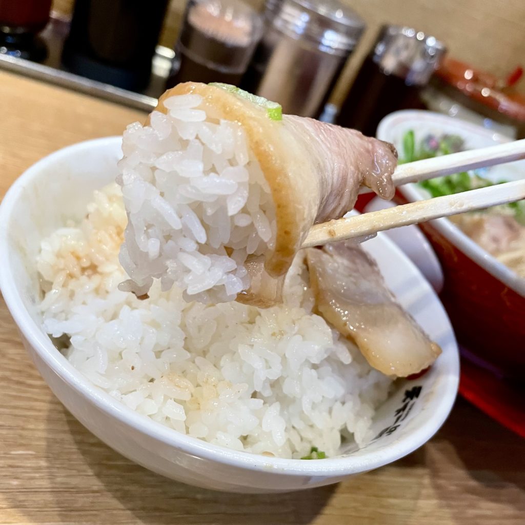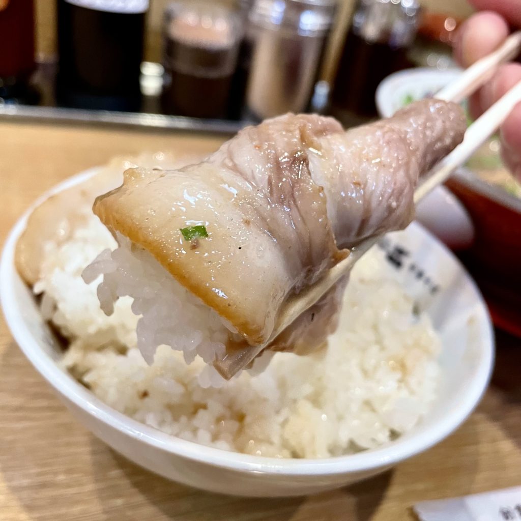 こってりスープに浸した豚トロ肉の米との相性は、天を仰ぎたくなるほど強烈!