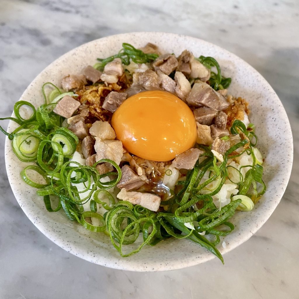 肉玉丼はこま切れチャーシューにフライドオニオン・ネギの上から卵黄が乗った豪華な丼!