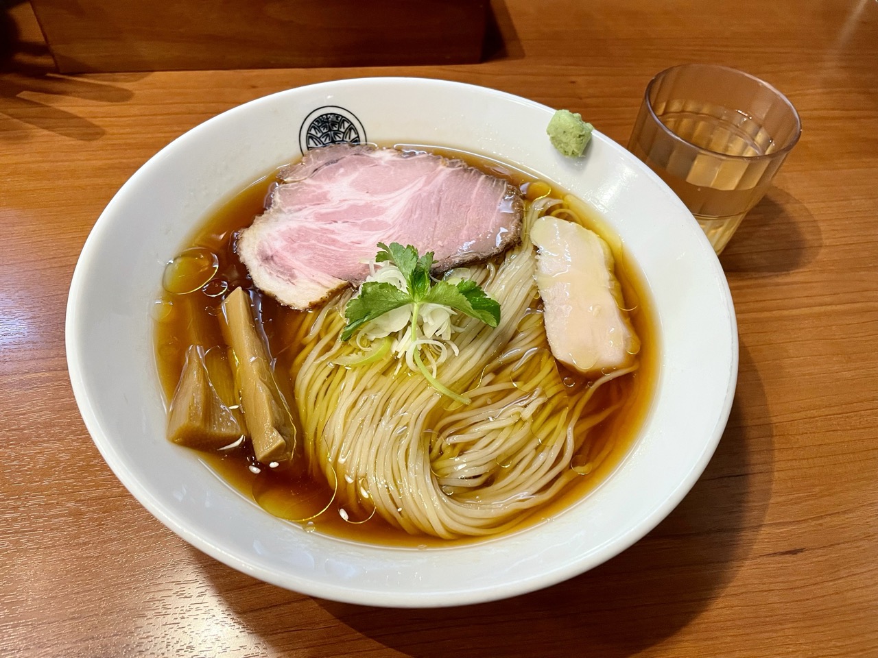 具材は豚チャーシュー・鶏チャーシュー・メンマ・ネギ・三つ葉、そしてわさびが添えられています。