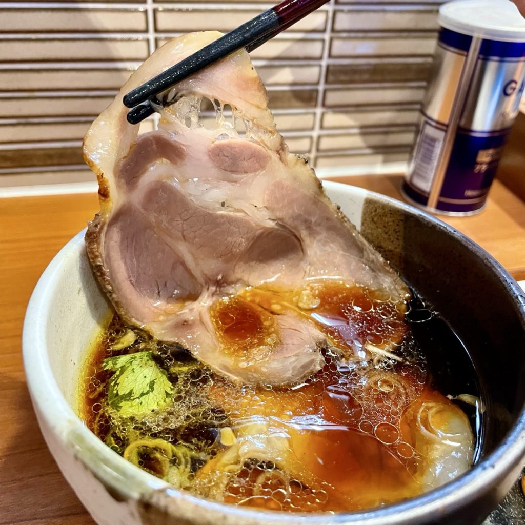 チャーシューの脂がどんどんつけ汁の旨味の層を重ねていく感じで、ストロングスタイルで飲むのも余裕でしたわ。