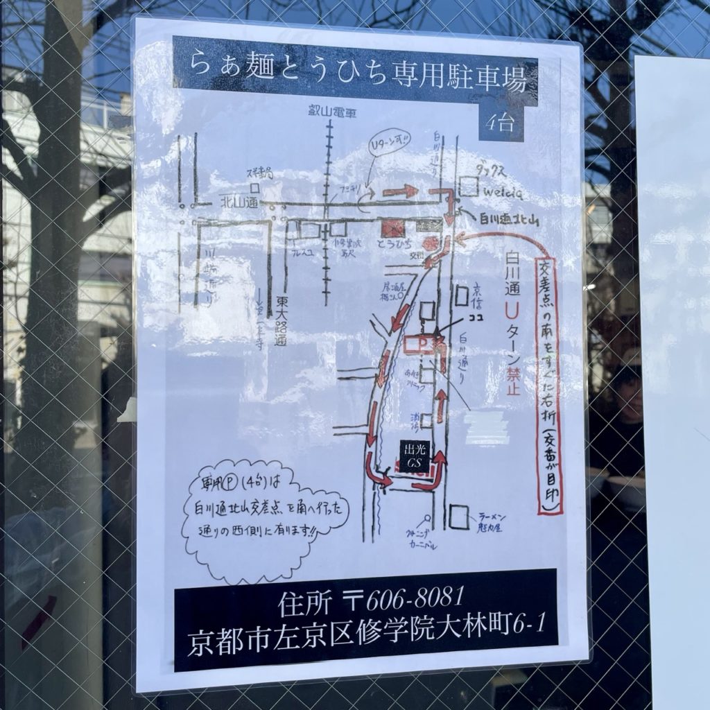 駐車場が面している白川通はUターン禁止なんですが、警察が監視していて捕まっているのを地元民でもよく見かけるので、くれぐれもご注意下さい。