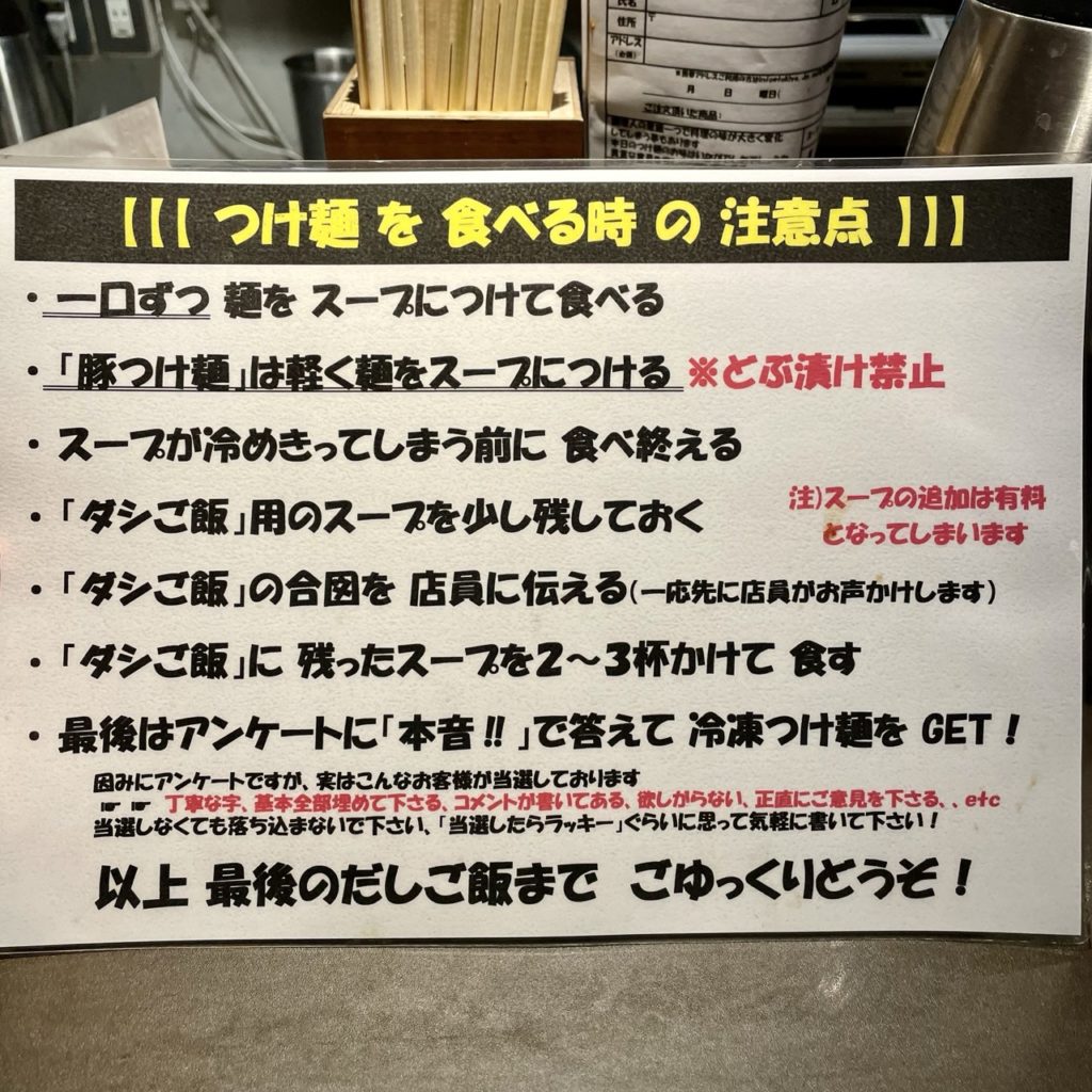 卓上にはアンケート用紙があり、書き込んで提出すると抽選で冷凍つけ麺が送られてくる取り組みをやってるそうです。