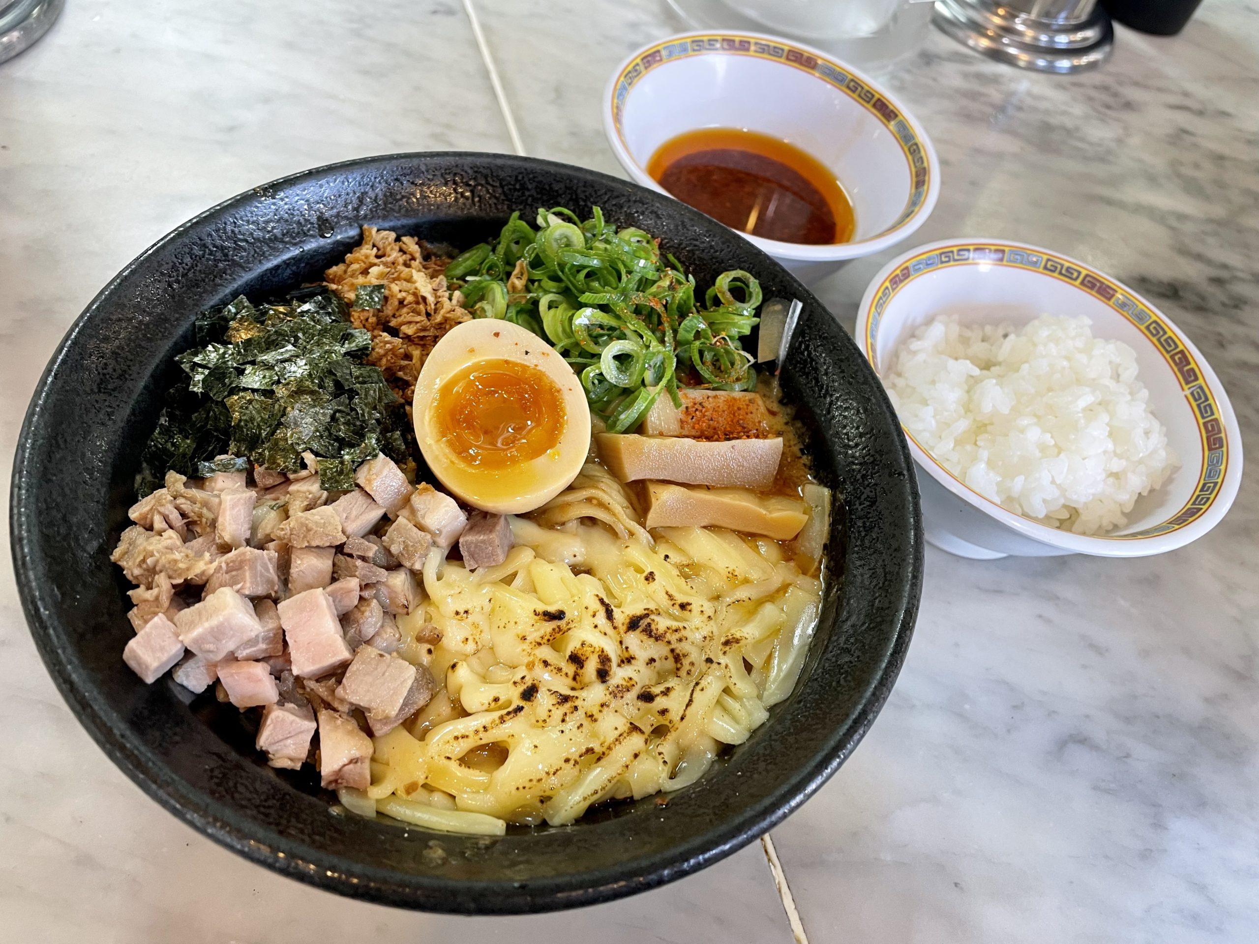 トッピングは味玉刻みチャーシューメンマ海苔フライドオニオンネギ炙られたチーズと賑やかです。