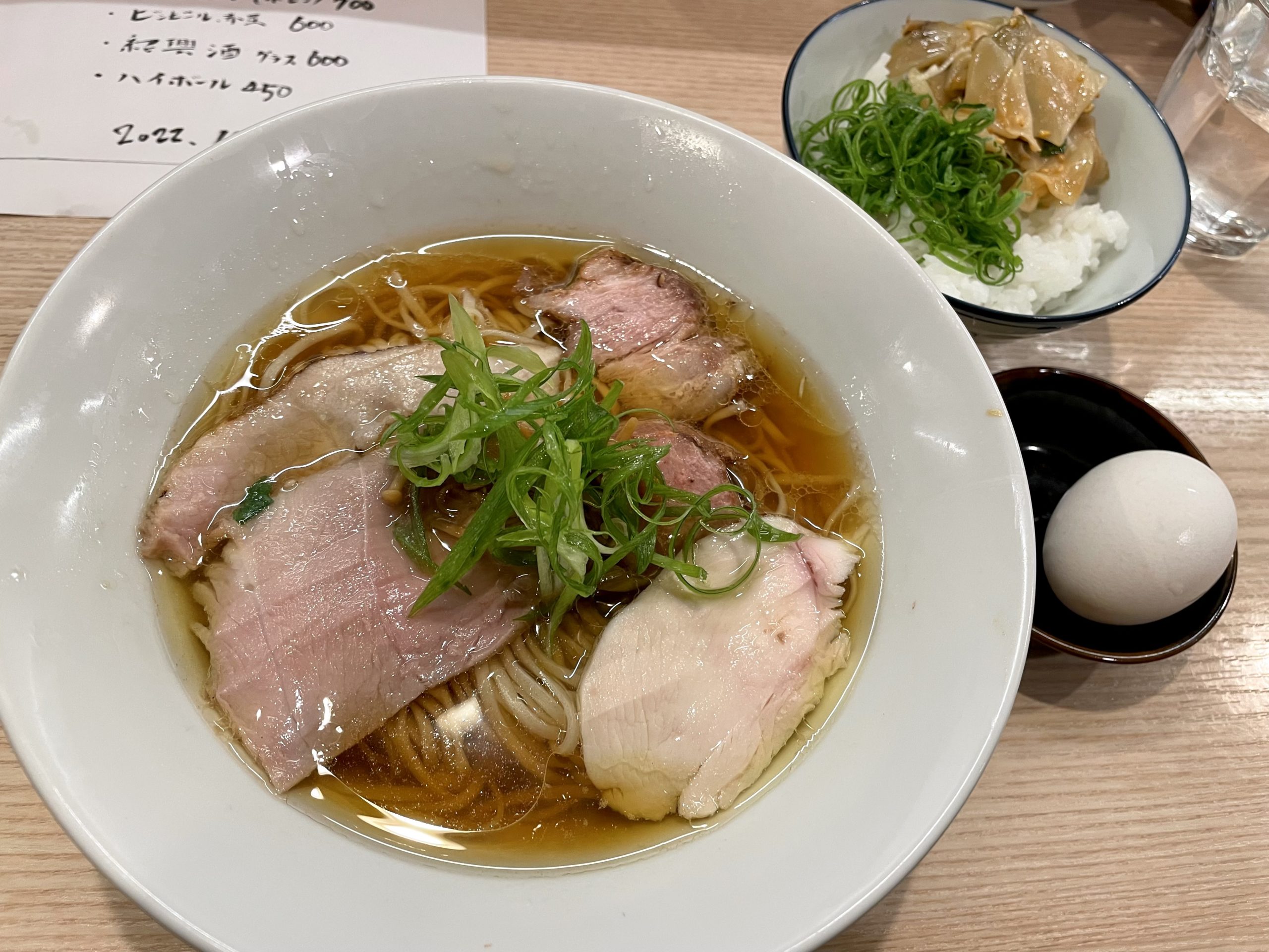 白湯スープの麻辣そばはおそらく好みドストライクだと思うんですが、今日は清湯の気分だったので鶏と豚のコンソメ中華そばと、サイドメニューからザーサイTKGと台湾風味玉をチョイスしました。
