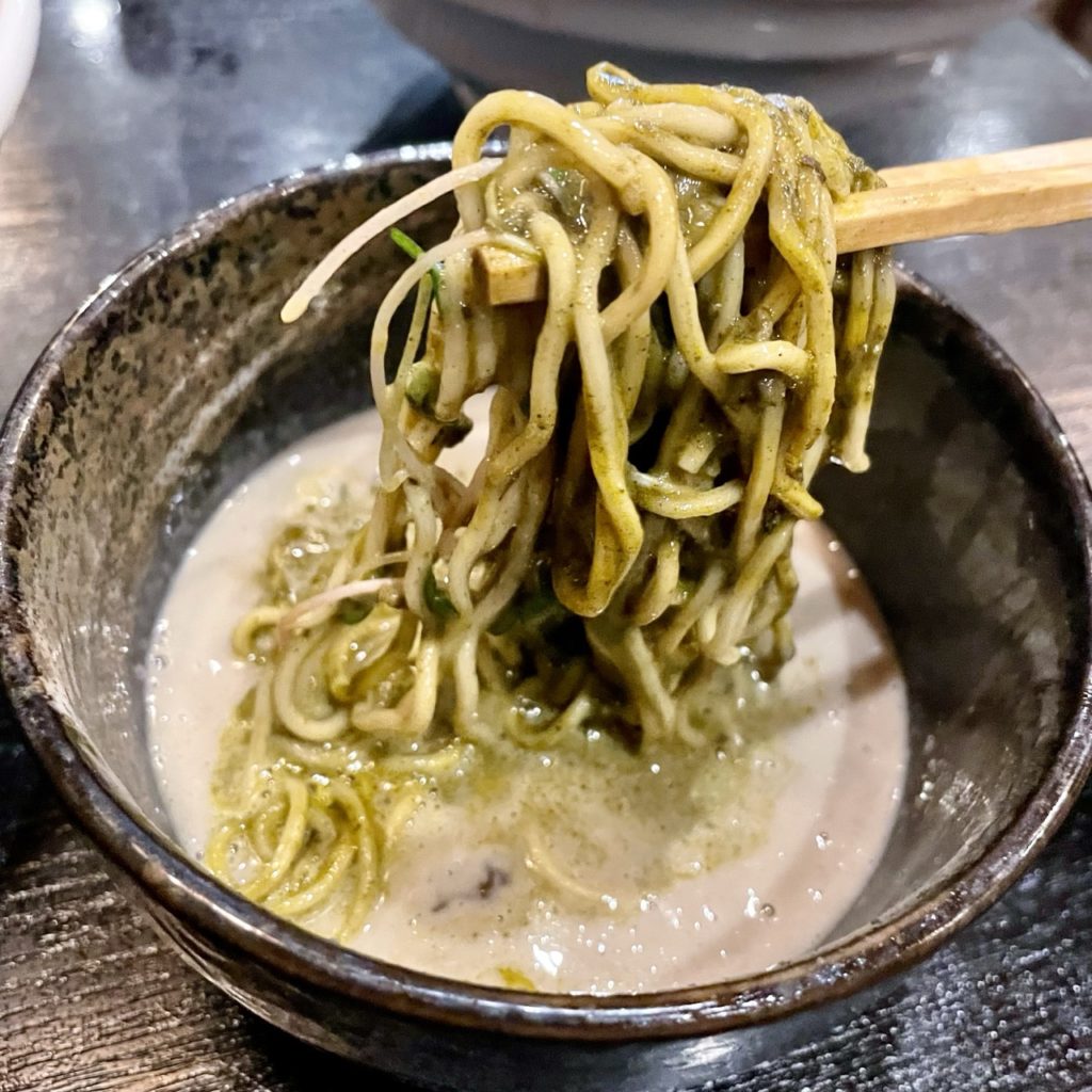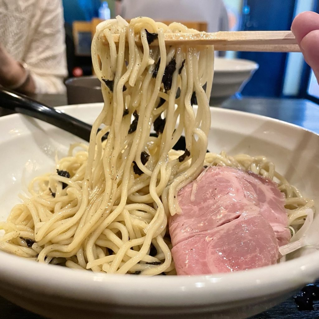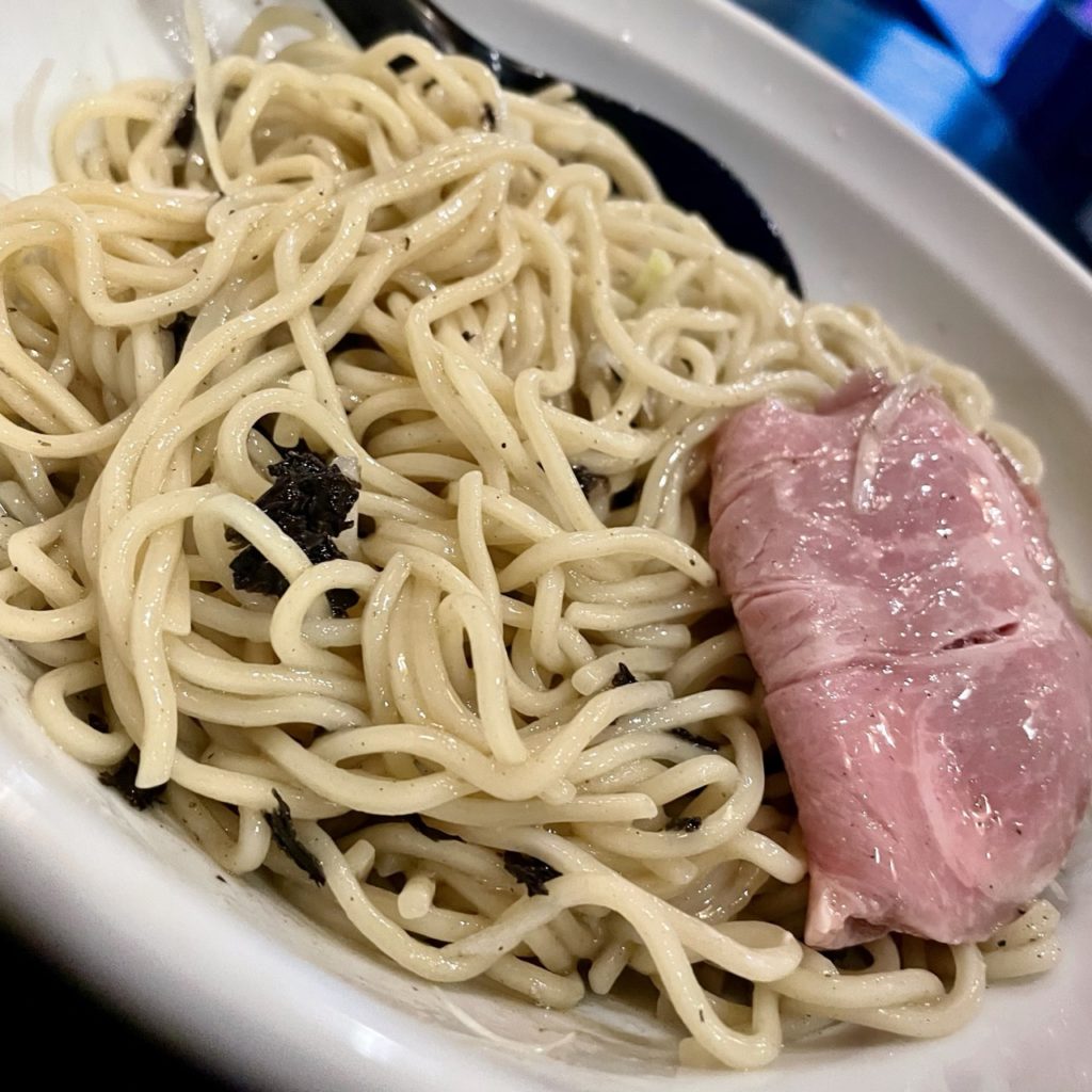 麺の底のほうは昆布出汁ダレのようなタレに浸かっており、混ぜるとほどよい塩加減な和テイストの混ぜ麺に早替わり!