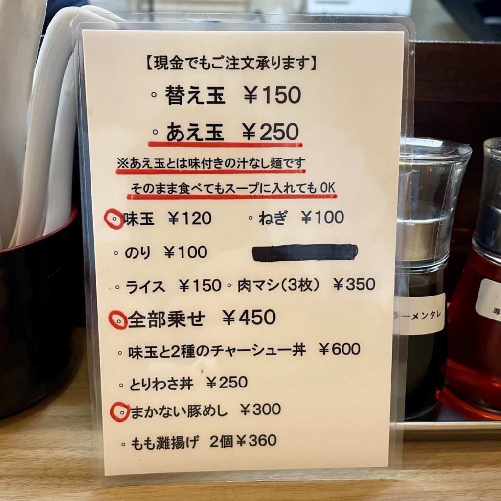 サイドメニューやトッピングはカウンターで現金注文も可能とのこと。2軒目で2杯食べて和え玉には辿り着けそうもないなぁ笑