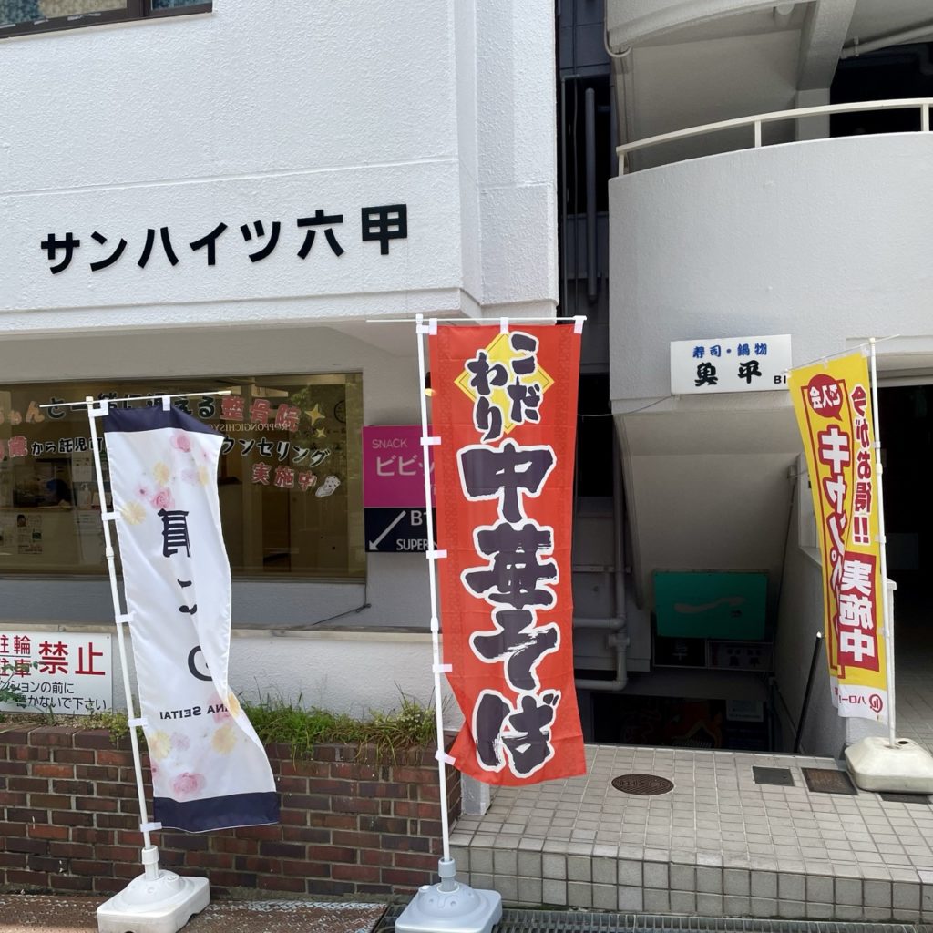 ありました、サンハイツ六甲という建物の地下ということで、この「中華そば」ののぼりが目印。