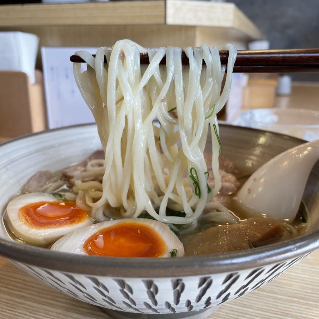 醤油味のらーめんは細麺、塩らーめんは平打ち太麺、つけめんはモチモチ太麺と、メニューによって麺が変わります。