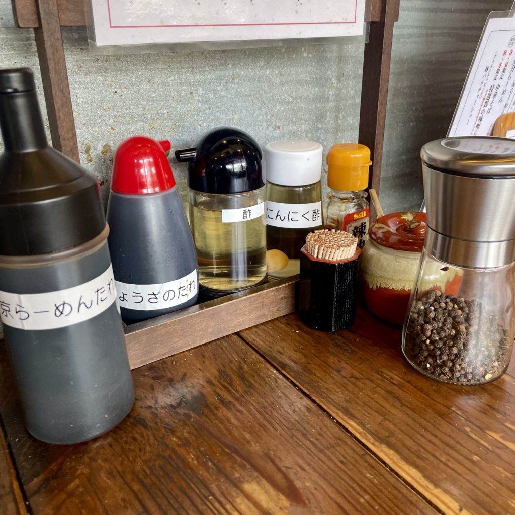 卓上調味料はお酢や胡椒、七味唐辛子と豊富です。
