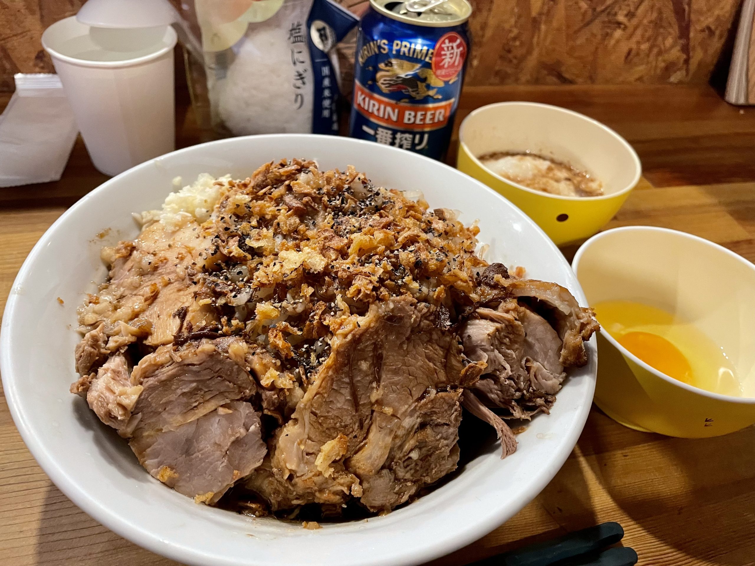 今日は汁なしをツマミに飲みたかったので、麺量は増やさず豚を増して、限定トッピングのとろろがあったのでそれも一緒に注文しました。